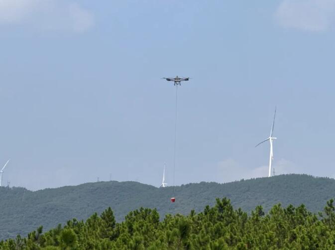 该项目位于郴州市宜章县五岭山脉,属陆地风力发电工程,35kV集电线路全线需建设22基双回路塔(直线塔10基、耐张塔12基)。复杂的地形导致传统运输方式效率低下、植被破坏严重,且铁塔基础分散、租地协调困难。为破解难题,项目管理团队周密策划,做好沿途运输路线踏勘,查找低空领域规范和民用无人机驾驶航空器运行安全管理规则,在确保安全合规的基础上,充分发挥自有作业力量优势,组建无人机运输团队,创新实施“大型运重、中型运量”运输策略,即大型重载无人机主攻50150KG钢筋、塔材等大重量构件运输,突破传统重载瓶颈;中型无人机负责50KG以内的水泥、砂石及工器具等散件配送,2台中型无人机编队,实现每小时45趟次的高频运输,高效支撑施工全流程。经实践检验,该技术预计将运输主工序工期缩短至10天,项目整体运输成本较预期降低20%。
