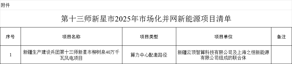 根据公示,新疆云顶智算科技有限公司及上海之恒新能源有限公司组成的联合体通过算力中心配套路径申报市场化并网新能源项目1个,为新疆生产建设兵团第十三师新星市柳树泉40万千瓦风电项目。