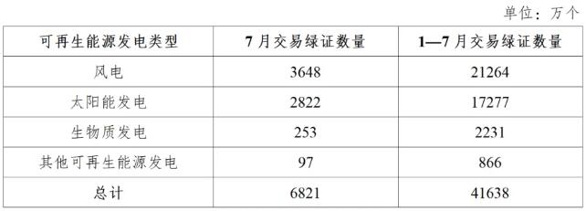 2025年7月,全国交易绿证6821万个,其中绿色电力交易绿证3472万个。2025年1—7月,全国交易绿证4.16亿个,其中绿色电力交易绿证1.41亿个。