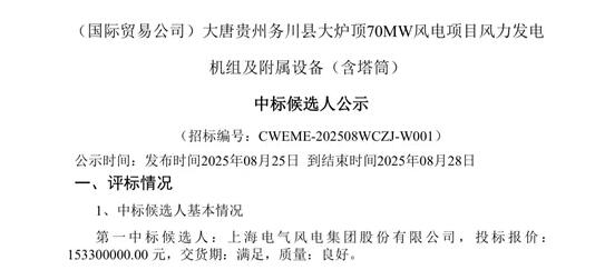 近日,大唐贵州务川县大炉顶70MW风电项目公开招标结果公告,显示电气风电成功中标该项目,将为其提供陆上卓越平台机组,双方在风电领域的合作得以持续拓展与加深。