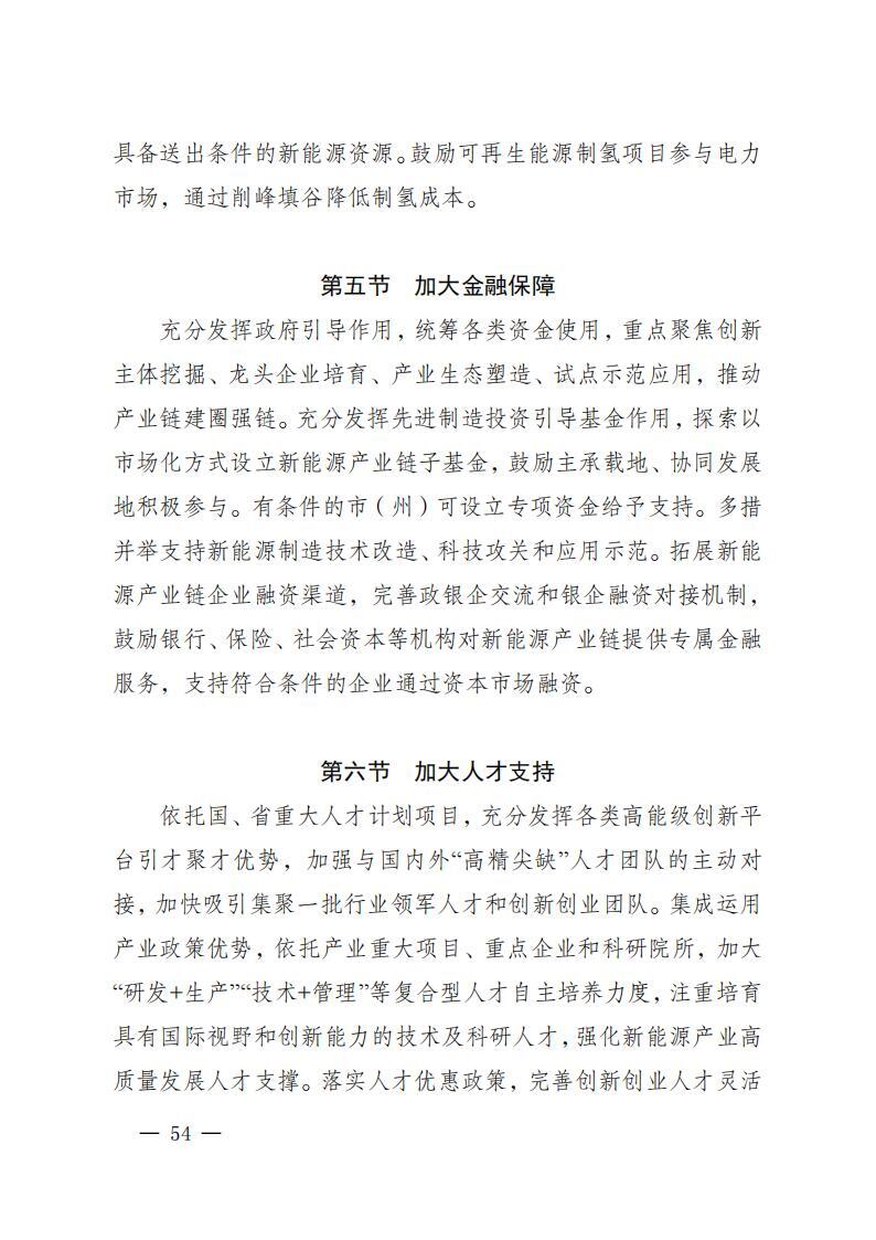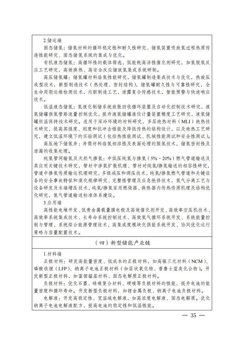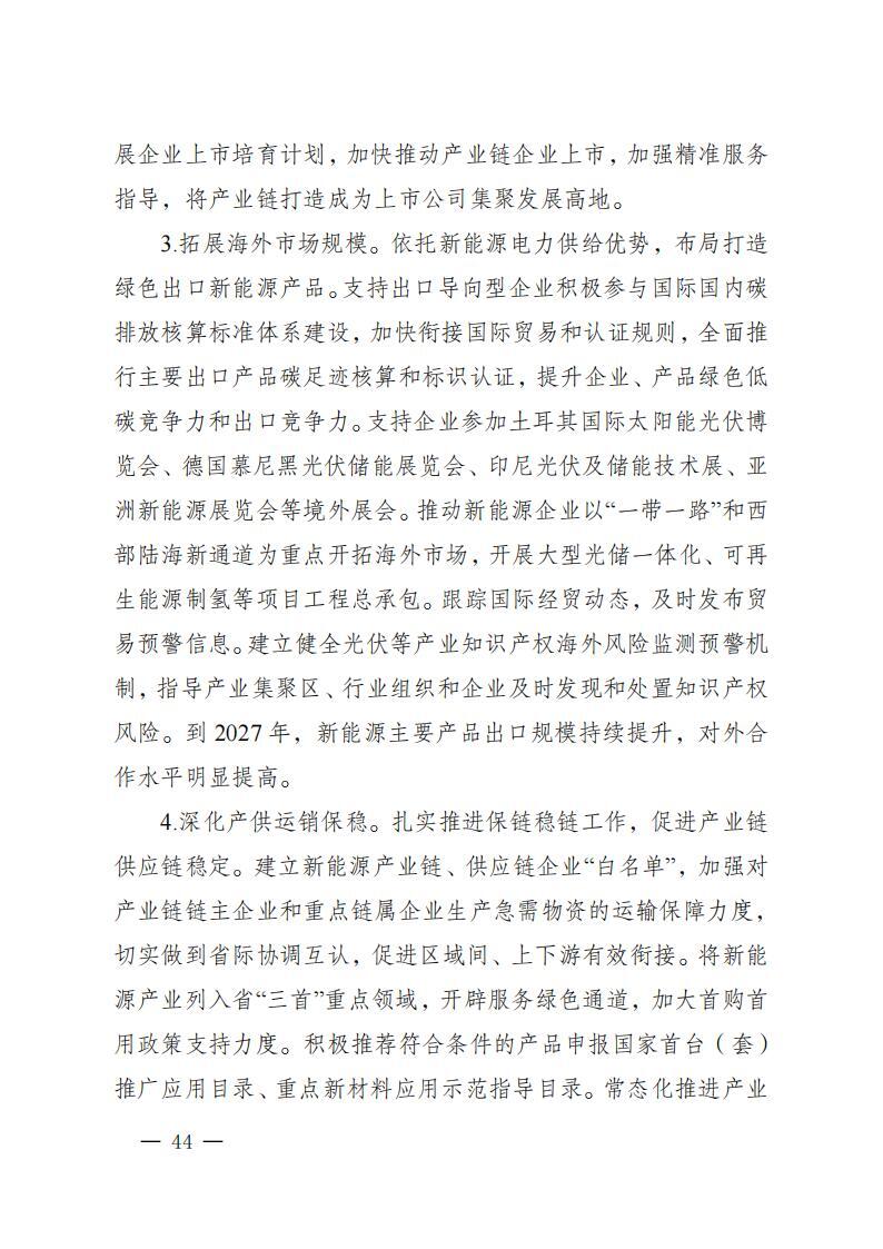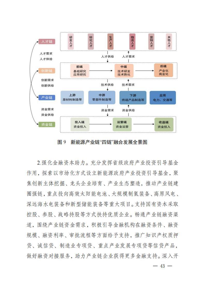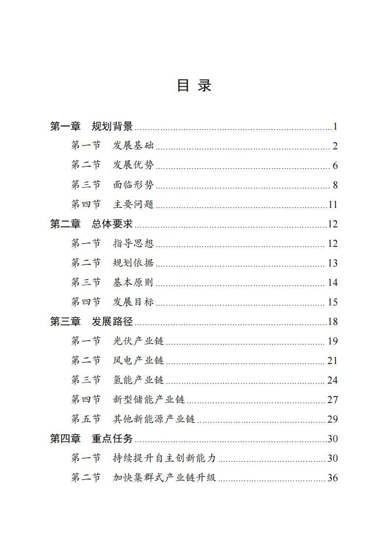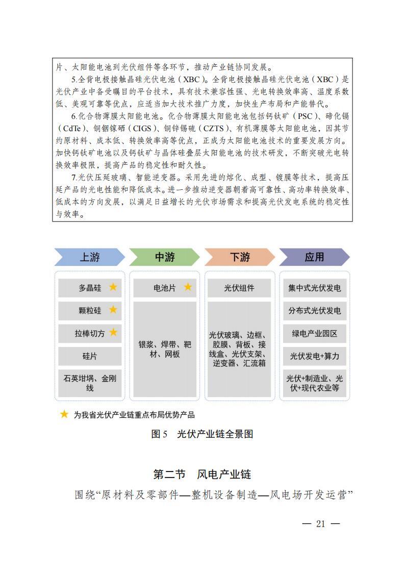 实施产业延链补链强链。光伏产业链,重点解决电子级多晶硅、光伏玻璃、银浆、坩埚、电池组件等环节产能不足短板,巩固多晶硅和高效电池片规模和技术优势,提升产能利用率,适度扩大拉棒、切片等低耗高效产能规模,发展新型高效太阳能电池等前沿产品。风电产业链,重点解决叶片、轴承、变压器等配套企业缺失,整机、塔筒企业竞争力弱等短板,发展大功率风力发电机、风电塔筒、风电整机等成套产品。氢能产业链,重点解决氢源不足、氢能基础设施滞后、利用率不足、应用场景规模偏小等问题,加速催化剂、质子交换膜、气体扩散层、双极板、膜材料等核心材料器件研发应用。新型储能产业链,加强金属锂、硫酸铁钠、复合磷酸铁钠、固态电解质、高容量密度电解液等关键材料的研发和产业化,推动锂离子电池、钠离子电池、固态电池、全钒液流电池等产品升级。