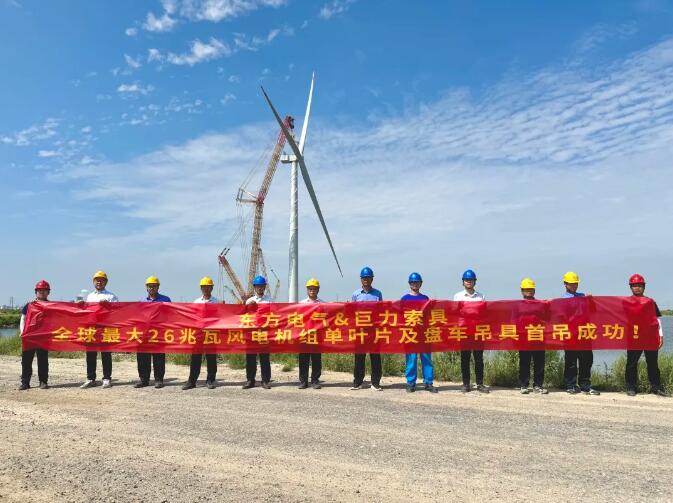 8月29日,由巨力索具股份有限公司为东方电气风电股份有限公司专项研制的26MW海上风电机组用大吨位单叶片吊具及大扭矩盘车系统,已于山东东营风电装备测试认证创新基地成功完成吊装作业。这是目前国内外最大兆瓦海上风电机组叶片吊装的优异解决方案,创新型解决了最大叶片的吊装难题。