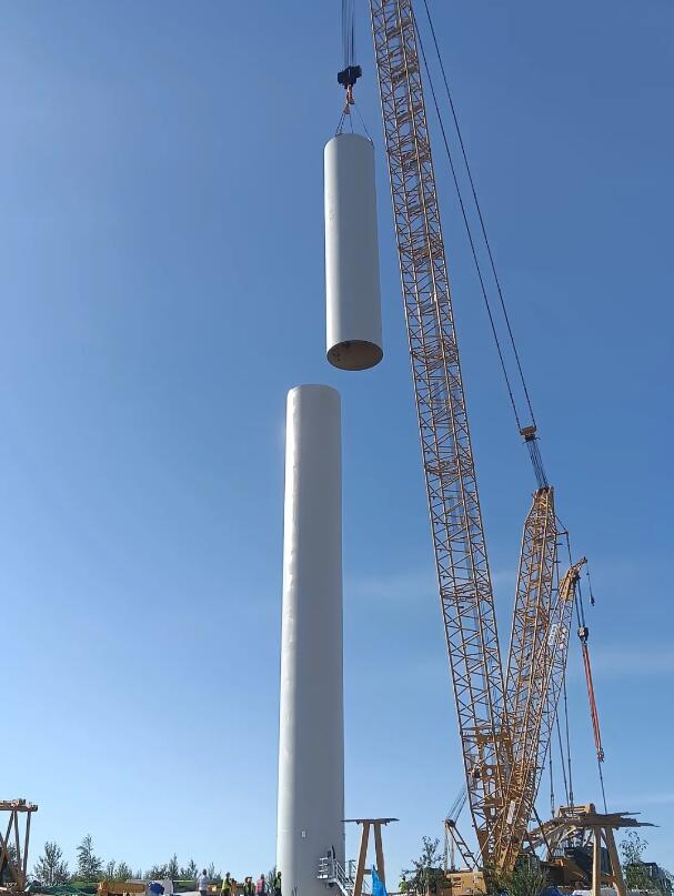 该项目位于河北省张家口市沽源县,规划安装32台运达6.25兆瓦风力发电机组,总装机容量达200兆瓦。塔筒结构共分五段,总高度112.3米,最大直径5.0米。该项目是国家推进绿色能源转型的重点示范工程,建成投运后,将充分利用当地丰富的风能资源,每年可实现数万吨碳减排,助力实现“碳达峰、碳中和”目标。