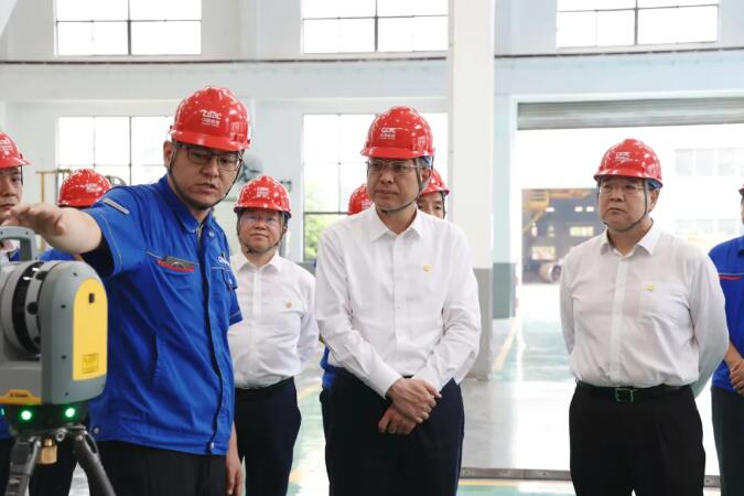 会谈前,倪真一行前往中国能建江苏装备公司调研,实地考察管道及支吊架系统集成、储能换热器、核电冷源系统设备、减震隔振装置等科技创新成果,详细了解企业经营状况并提出工作要求。