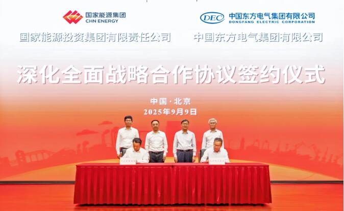 9月9日,中国东方电气集团有限公司与国家能源投资集团有限责任公司在京签署深化全面战略合作协议。东方电气集团党组书记、董事长罗乾宜,总经理、党组副书记张彦军,国家能源集团党组书记、董事长邹磊,总经理、党组副书记冯来法共同见证协议签署。东方电气集团党组成员、副总经理王军,国家能源集团党组成员、副总经理傅振邦代表双方签署协议。