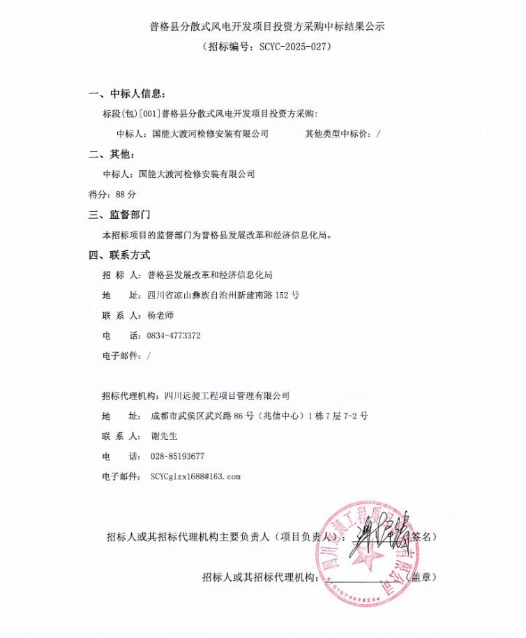 根据公示,四川普格县分散式风电开发项目中标人为国能大渡河检修安装有限公司。