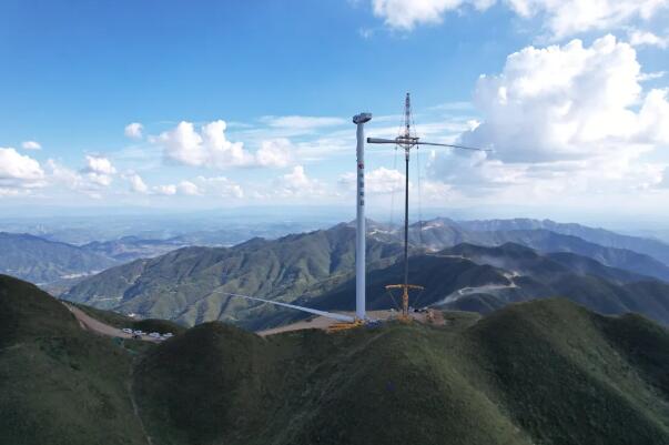 欧阳海风电场二期项目位于桂阳县北部泗洲山,海拔 790米~1290米,总装机容量 50兆瓦,设计安装 10 台单机容量为 5 兆瓦的风力发电机组,风机轮毂高度达 115 米,叶轮直径 190 米,单支叶片长 92 米的大型风机设备,预计年上网电量 1.138亿千瓦时。在复杂山地环境中,项目团队采用“单叶片空中组对” 的先进吊装工艺,克服了作业平台狭窄、气流复杂多变等挑战。为攻克山区施工难题,项目团队多管齐下:运输环节针对沿途村庄密集、道路狭窄多弯、杆线横跨等问题,安排专人专项负责,通过优化道路倒车平台、将叶片车运输方式由后举调整为前举,解决叶片扫山体、转弯半径不足难题;同时与县电力公司对接,制定专项停电保障计划,按时完成杆线迁移工作;管理上创新采用 “四同步” 作业法,将基础浇筑、设备预装、线路敷设与吊装准备并联推进,同步开发 “窗口期预警系统” 精准捕捉施工黄金时段,大幅压缩建设周期;严格执行吊装许可和吊装作业票制度,全面落实危险性较大工程分部分项工程施工管理要求,实施现场全时段督导,确保吊装作业安全可靠。