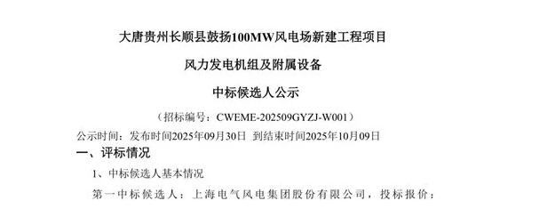 近日,大唐贵州长顺县鼓扬100MW风电场新建工程项目风力发电机组及附属设备公开招标结果公告,显示电气风电成功中标该项目,将为其提供陆上卓越平台机组,双方在风电领域的合作得以持续拓展与加深。