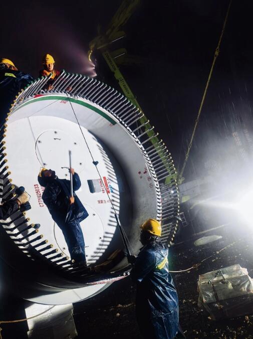 本次吊装的1号风机为6.25兆瓦智能型机组,风轮直径216米,轮毂中心高度120米,相当于将一座40层楼高的巨型结构稳稳矗立在山巅。在吊装的关键阶段,施工团队在地面与百米高空协同操作,凭借“高空穿针”级的精度,将叶根与轮毂的对接误差严格控制在1毫米以内,并高效完成128根高强度螺栓的穿装与紧固。