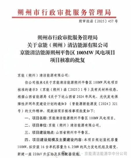 该项目位于山西省朔州市平鲁区,规划装机容量100MW,拟安装16台单机容量为6.25MW的风力发电机组。项目总投资约5.2亿元,是山西省2026年能源发展规划重点工程之一。项目的核准批复是前期工作取得里程碑式突破的重要标志,为项目早日开工建设、实现并网发电奠定了坚实基础。