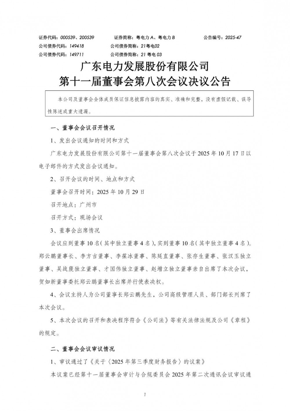 10月31日,广东电力发展股份有限公司发布第十一届董事会第八次会议决议公告。