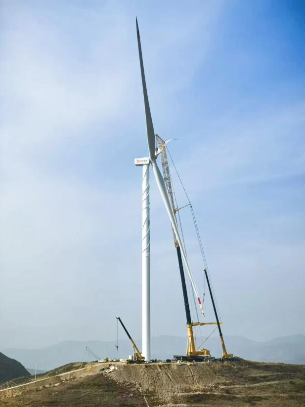 该项目位于河北省张家口市赤城县,配套建设3.1兆瓦/6.2兆瓦时储能系统。风机轮毂中心高度达120米,塔筒最大长度30米,叶片长度99.5米。
