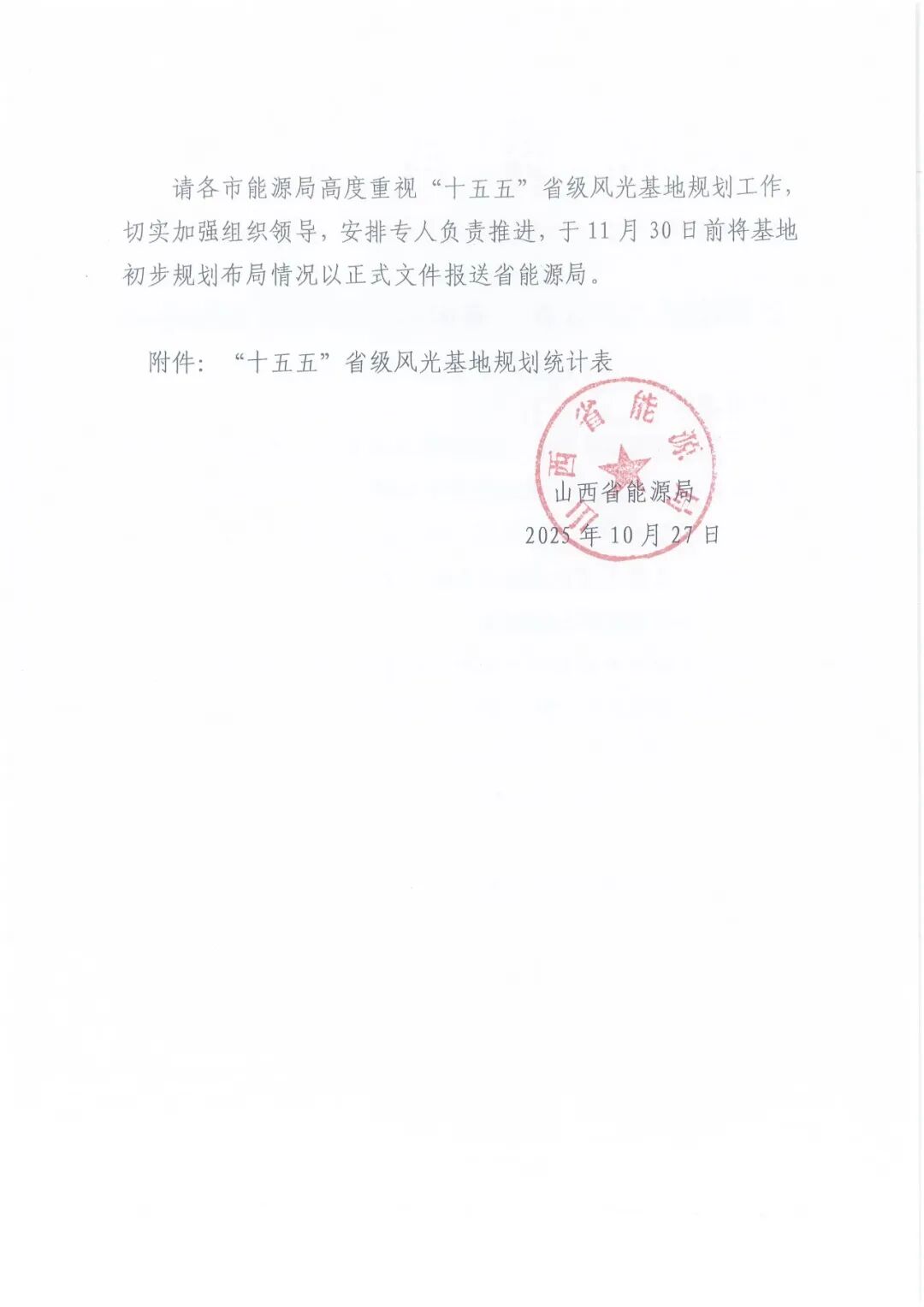 10月27日,山西省能源局发布《关于做好“十五五”省级风光基地规划的通知》。《通知》指出,基地项目选址原则上以单个县域为单元,也可结合周边县域资源及建设条件跨县域整合规划,实施风光一体化布局建设,单个基地项目规模不低于50万千瓦,投资主体要相对集中,切实提升能源供应稳定性和综合开发效益。