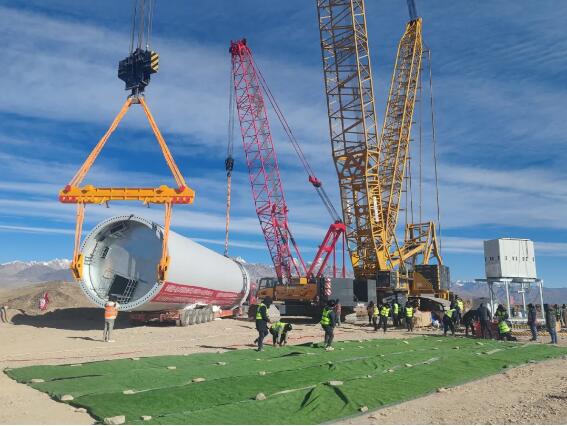 自开工以来,华能国际工程公司项目团队充分发挥在新能源建设领域的专业优势,针对3000多米高海拔、复杂地形等特殊环境,科学制定施工方案,精心组织吊装作业。面对山区运输条件差、吊装平台狭窄、气候多变等多重挑战,项目团队提前策划、精准施策,通过优化吊装工艺、强化安全管控、合理安排工期,确保了首台风机塔筒吊装安全、精准、高效完成。