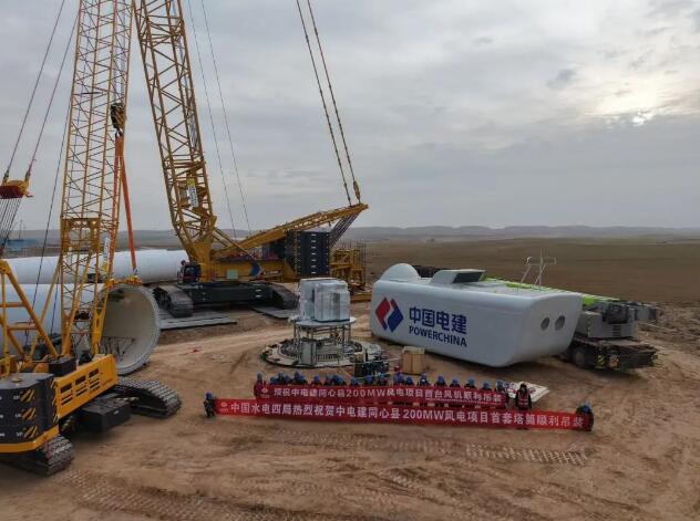 11月12日,由酒泉新能源公司承制的中电建同心县200兆瓦风电项目首套塔筒顺利吊装。