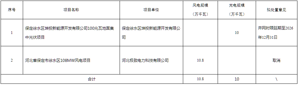 保定徐水区坤投新能源开发有限公司100兆瓦地面集中光伏项目,规模10万千瓦,项目单位为保定徐水区坤投新能源开发有限公司,拟处置意见为并网时限延期至2026年12月31日。