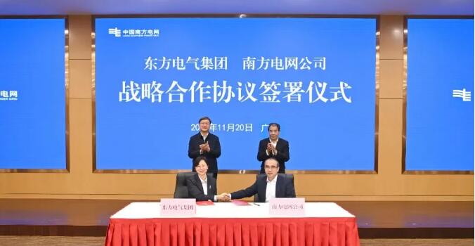 11月20日,中国东方电气集团有限公司与中国南方电网有限责任公司在广州签署战略合作协议。东方电气集团党组书记、董事长罗乾宜,南方电网公司党组书记、董事长孟振平,共同见证协议签署。集团公司党组成员、总会计师吕双与南方电网公司党组成员、副总经理吴小辰代表双方签订协议。