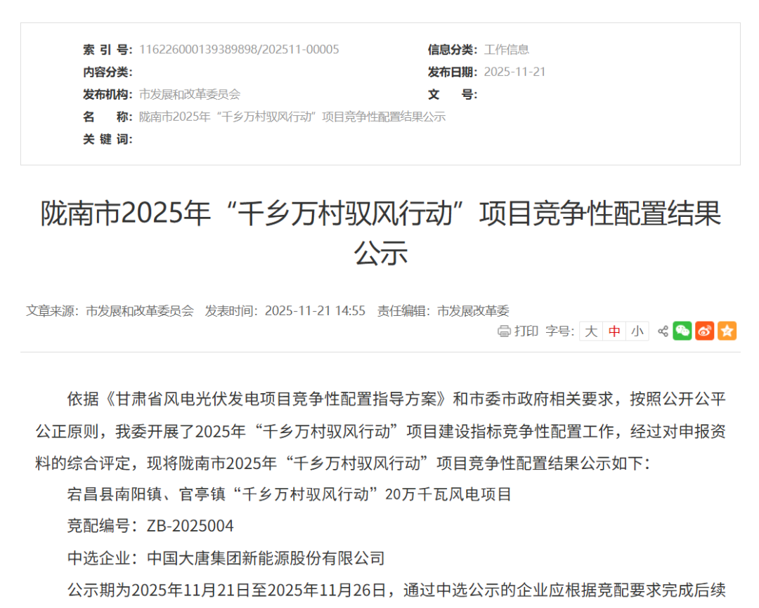 根据公示,宕昌县南阳镇、官亭镇“千乡万村驭风行动”20万千瓦风电项目中选企业为中国大唐集团新能源股份有限公司。