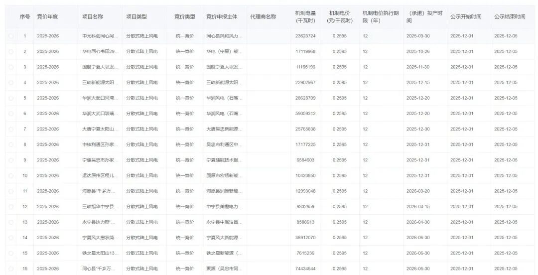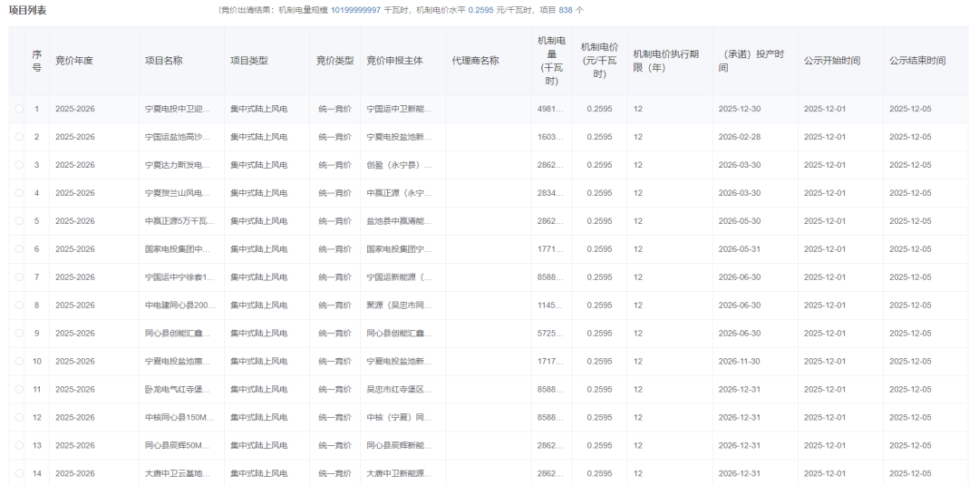 12月1日,宁夏2025-2026年新能源机制电价竞价结果公布。