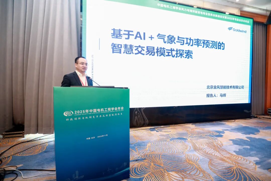 近日,“2025年中国电机工程学会年会”在湖南长沙成功举办。金风慧能副总经理马辉在会上发表了题为《基于AI+气象与功率预测的智慧交易模式探索》的主旨演讲,指出在新能源全面入市与交易机制加速演进背景下,行业亟需从传统“点预测+经验决策”走向“概率认知+闭环决策”,以“认知一体化、风险主动化、进化自动化”为主线,推动新能源从“被动参与”迈向“主动经营”,更前置、更量化地识别与管理交易风险,释放新能源全生命周期的经营价值。