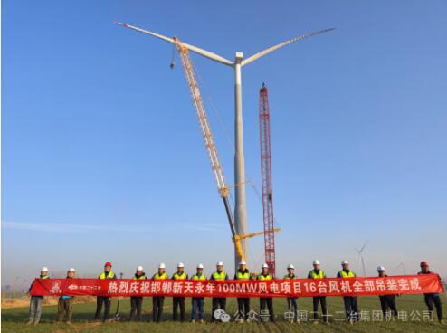 11月29日,随着最后一台风机叶片在160米高空与机舱轮毂精准对接,中国二十二冶机电公司邯郸新天永年100MW风电项目全面完成16台风机吊装工作,项目取得突破性进展,为项目如期实现全部并网发电奠定坚实基础。