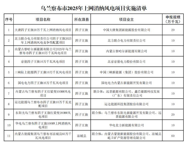 按照《内蒙古自治区能源局关于开展2025年上网消纳风电项目竞争性配置的通知》(内能源新能字〔2025〕654号)和《内蒙古自治区上网消纳新能源发电项目竞争性配置管理办法》等文件精神,经第三方服务机构评审优选,形成了乌兰察布市2025年上网消纳风电项目实施清单,现予以公示。