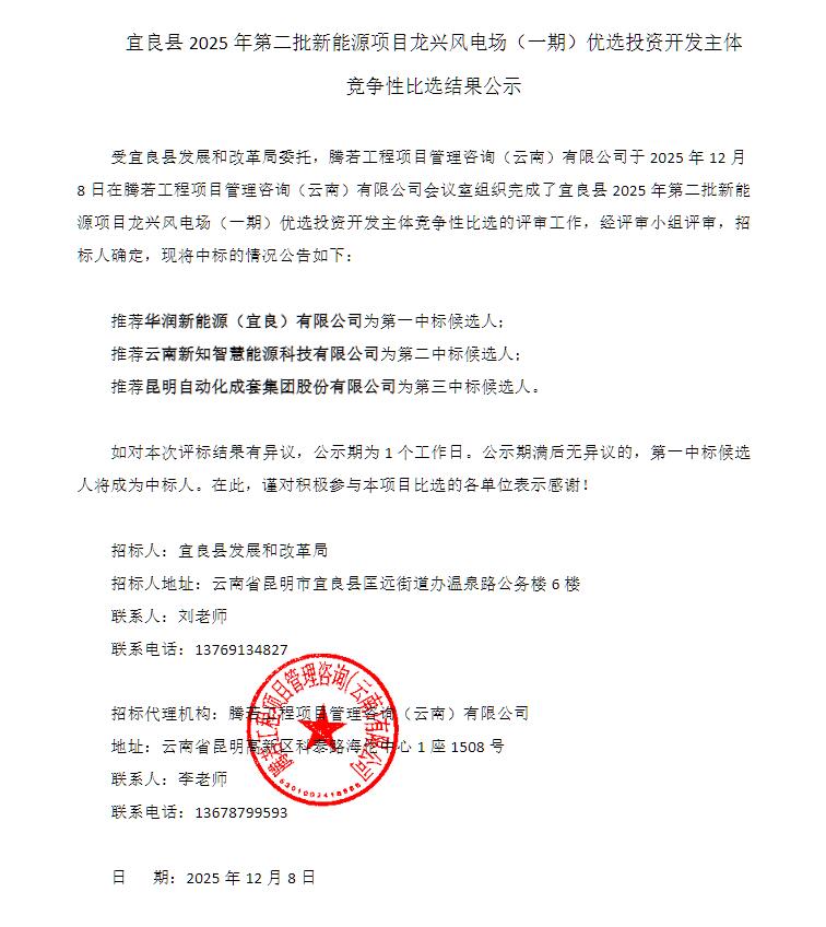 12月8日,宜良县2025年第二批新能源项目龙兴风电场(一期)优选投资开发主体比选结果公示。
