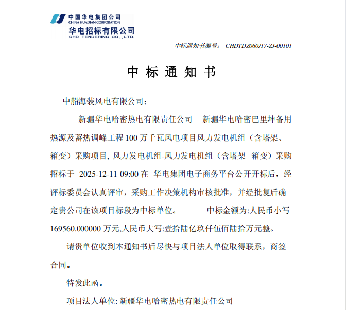2025年12月19日,中船科技旗下中船海装正式获得新疆华电哈密巴里坤备用热源及蓄热调峰工程100万千瓦风电项目中标通知书,这是继新疆华电天山北麓610万千瓦新能源项目(标段三)后,中船科技在新疆区域拿下的又一GW级(100万千瓦)风电订单,又一次彰显了中船科技在风电大基地建设方面的硬核实力与市场竞争力。