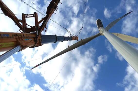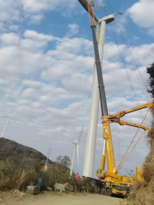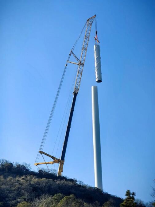 该项目拟拆除原有一期项目48台850KW风机,选取其中17个机位点安装单机容量为6.25MW的风电机组。本次风力发电机组塔高105米,叶轮直径182米,单机容量6.25MW,总装机容量106.25MW。为确保首台风电机组顺利吊装,项目部精心组织、超前筹划,严格编审吊装作业计划,制定可靠的吊装安全措施。吊装期间,项目管理人员及时掌握气象信息,提前安排施工计划,周密制定应急预案,全方位跟踪吊装全过程,项目部在公司的统筹部署下,积极把握冬季施工的窗口期,持续优化施工组织,反复研究吊装方案,高效推进风机吊装工作。