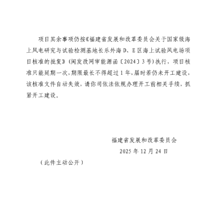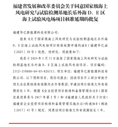 根据福建省发展和改革委员会最新发布的信息,国家级海上风电研究与试验检测基地长乐外海D、E区海上试验风电场项目核准延期已获正式批复。此外,宁德深水A区海上风电场项目核准延期也同一天获得批复。