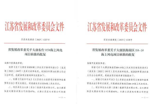 12月24日,从江苏省发展和改革委员会传来振奋人心的喜讯:江苏公司竞配取得的大唐东台H5#(40万千瓦)、滨海南区H4-1#(20万千瓦)两个海上风电项目正式获得核准批复。