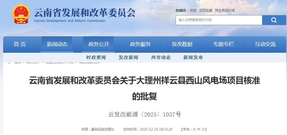 12月25日,云南省发展和改革委员会发布关于大理州祥云县西山风电场项目核准的批复。