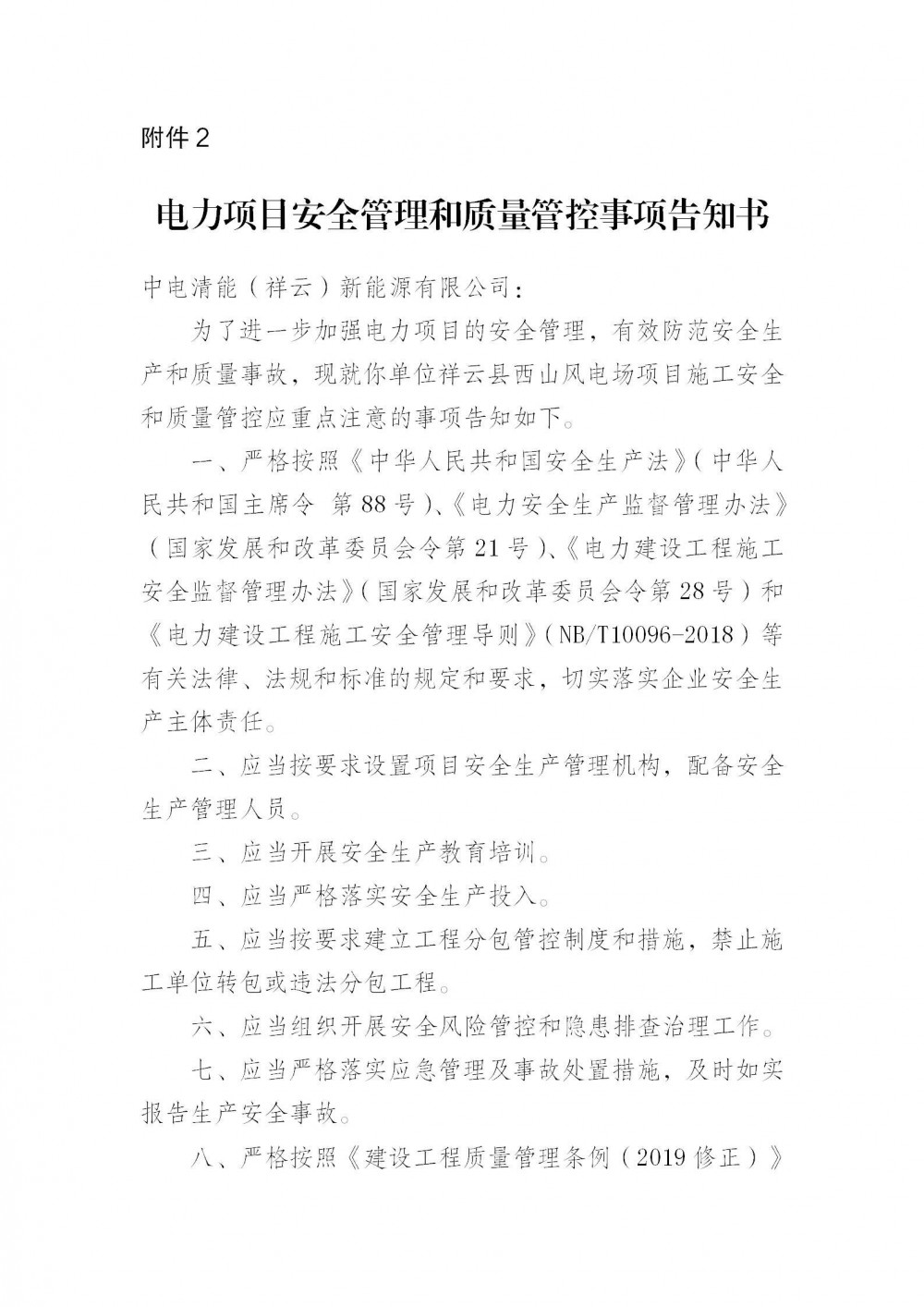 六、请项目法人严格按照《建设工程质量管理条例(2019修正)》(国务院令第714号)、《电力建设工程施工安全监督管理办法》(国家发展和改革委员会令第28号)和《电力建设工程施工安全管理导则》(NB/T10096-2018)等有关法律、法规和标准的要求,切实履行安全生产主体责任,做好施工安全管理和工程质量管控等各项工作,有效防范安全生产和质量事故的发生。请省能源局加强对项目在施工安全和工程质量等方面的监督管理,杜绝违规开工等行为。