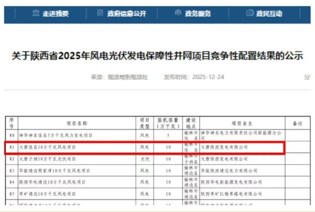 12月24日,陕西省2025年新能源项目竞争性配置结果正式公布,大唐延安热电厂申报的陕西省榆林市佳县10万千瓦风电项目成功获得项目建设指标。