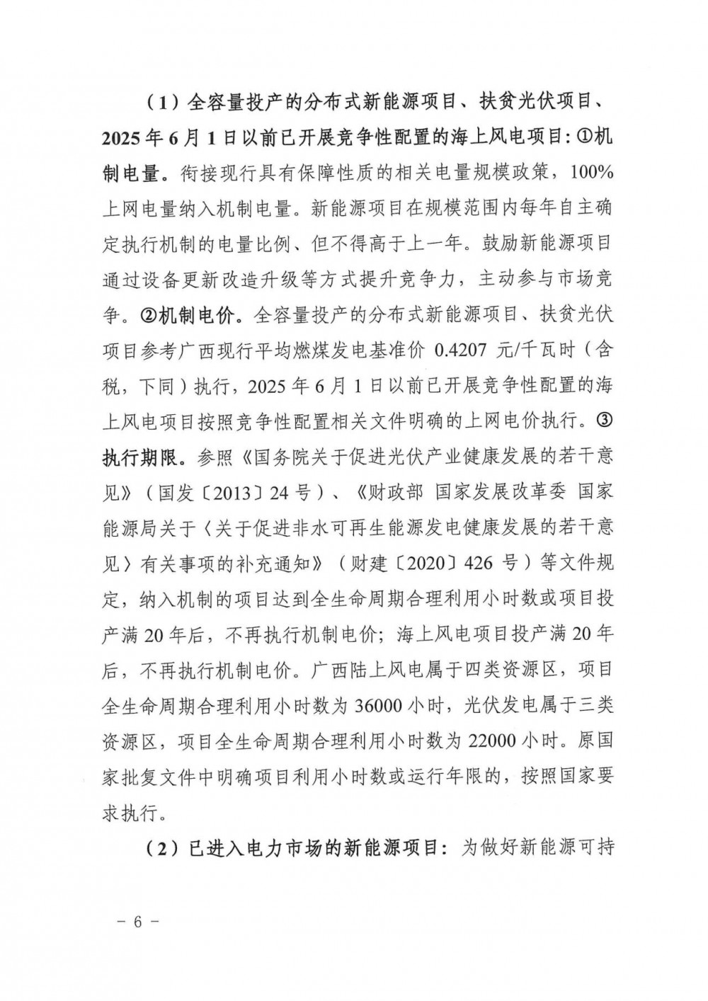 执行期限。参照<<国务院关于促进光伏产业健康发展的若干意见>>(国发[2013]24号)、<<财政部国家发展改革委国家能源局关于<关于促进非水可再生能源发电健康发展的若干意见>有关事项的补充通知>>(财建[2020]426号)等文件规定,纳入机制的项目达到全生命周期合理利用小时数或项目投产满20年后,不再执行机制电价;海上风电项目投产满20年后,不再执行机制电价。广西陆上风电属于四类资源区,项目全生命周期合理利用小时数为36000小时,光伏发电属于三类资源区,项目全生命周期合理利用小时数为22000小时。原国家批复文件中明确项目利用小时数或运行年限的,按照国家要求执行。