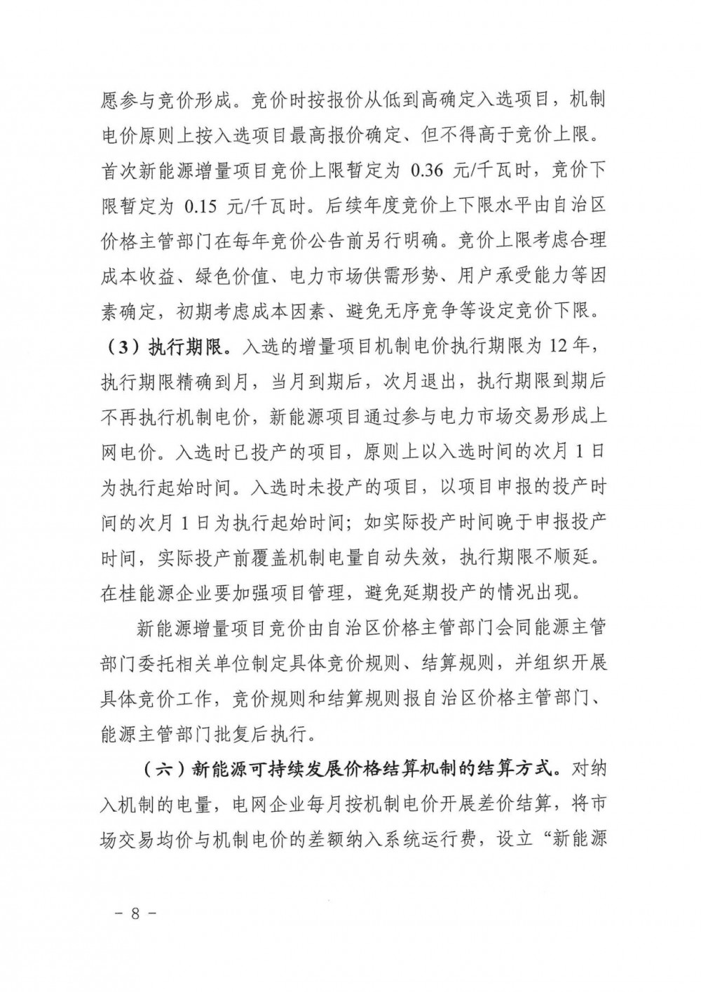 执行期限。入选的增量项目机制电价执行期限为12年,执行期限精确到月,当月到期后,次月退出,执行期限到期后不再执行机制电价,新能源项目通过参与电力市场交易形成上网电价。入选时已投产的项目,原则上以入选时间的次月1日为执行起始时间。入选时未投产的项目,以项目申报的投产时间的次月1日为执行起始时间;如实际投产时间晚于申报投产时间,实际投产前覆盖机制电量自动失效,执行期限不顺延。在桂能源企业要加强项目管理,避免延期投产的情况出现。新能源增量项目竞价由自治区价格主管部门会同能源主管部门委托相关单位制定具体竞价规则、结算规则,并组织开展具体竞价工作,竞价规则和结算规则报自治区价格主管部门、能源主管部门批复后执行。