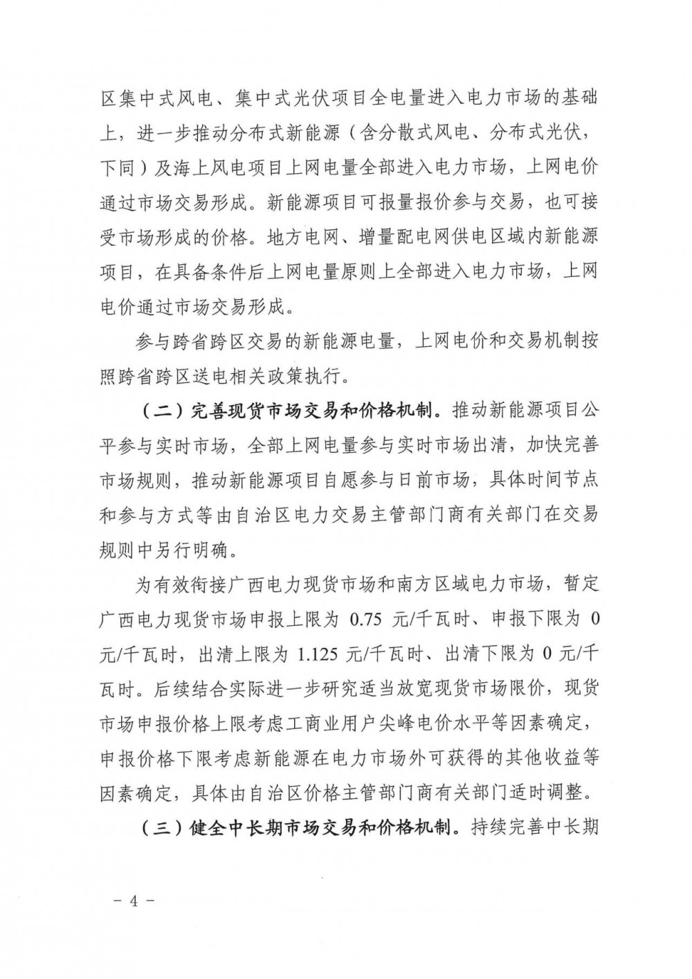 文件指出,为有效衔接广西电力现货市场和南方区域电力市场,暂定广西电力现货市场申报上限为0.75元/千瓦时、申报下限为0元/千瓦时,出清上限为1.125元/千瓦时、出清下限为0元/千瓦时。后续结合实际进一步研究适当放宽现货市场限价,现货市场申报价格上限考虑工商业用户尖峰电价水平等因素确定,申报价格下限考虑新能源在电力市场外可获得的其他收益等因素确定,具体由自治区价格主管部门商有关部门适时调整。