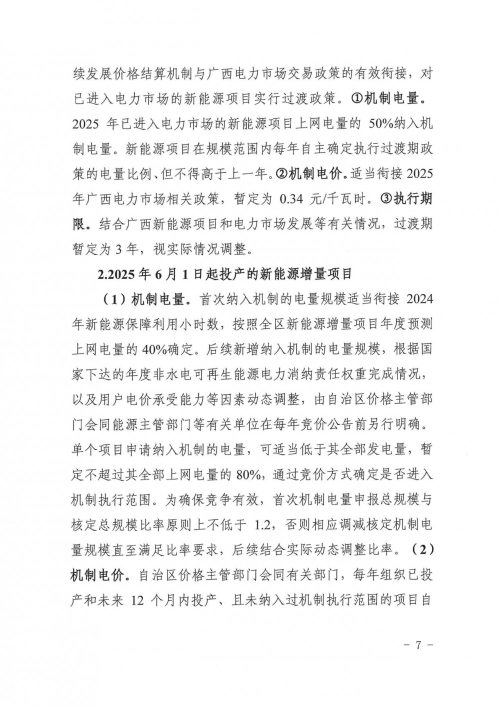 机制电价。适当衔接2025年广西电力市场相关政策,暂定为0.34元/千瓦时。