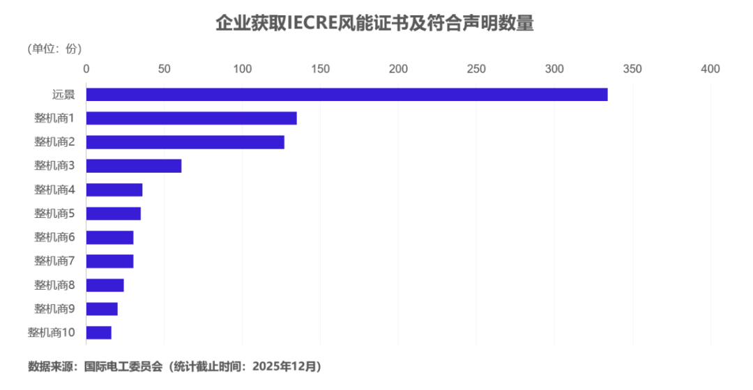 国际电工委员会(IEC)日前发布的最新数据显示,在全球风能领域累计颁发的1095份IECRE有效证书及符合声明中,远景能源独占334份,数倍乃至数十倍于其他风电整机商,占到全球风能领域已颁证书总量的三成,以绝对优势稳居全球第一。作为全球可再生能源领域最严苛、最具公信力的认证体系之一,IECRE代表国际最高质量与技术标准。远景能源获证数量的遥遥领先,不仅是企业在风电技术实力与质量管理能力的集中体现,更标志着中国风电产业在国际标准话语权上的重要突破。