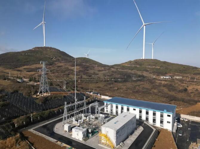 ▲升压站是风电场的关键设施,负责将风机发出的电能汇集、升压至符合电网要求的高压等级,以便远距离输送。图为齐岳山风电场“以大代小”改造项目新建的升压站。摄影:冯家坤