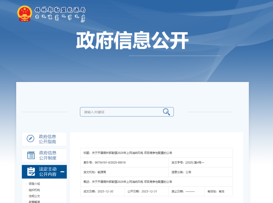 2025年12月31日,内蒙古锡林郭勒盟能源局发布《关于开展锡林郭勒盟2025年上网消纳风电项目竞争性配置的公告》。