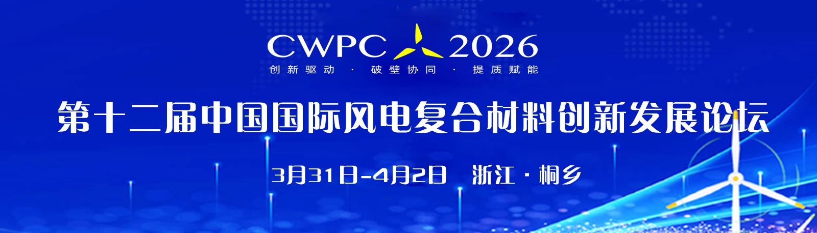 为汇聚行业智慧,破壁技术瓶颈,进一步提升风电叶片设计和制造水平,赋能产业技术交流合作与产学研用深度融合,探索风电复合材料产业向高性能、绿色化、智能化转型路径,推动风电产业可持续高质量发展。第十二届中国国际风电复合材料创新发展论坛(CWPC2026)拟于2026年3月31日-4月2日在浙江桐乡召开。大会将重点围绕“创新驱动·破壁协同·提质赋能”的主题深入研讨交流。 会议将邀请国内外著名的风电整机企业、叶片企业、原材料供应商、开发企业、研究机构、设计机构、第三方机构等单位的高管、技术生产采购营销等部门负责人及行业知名专家出席大会,具体安排如下: