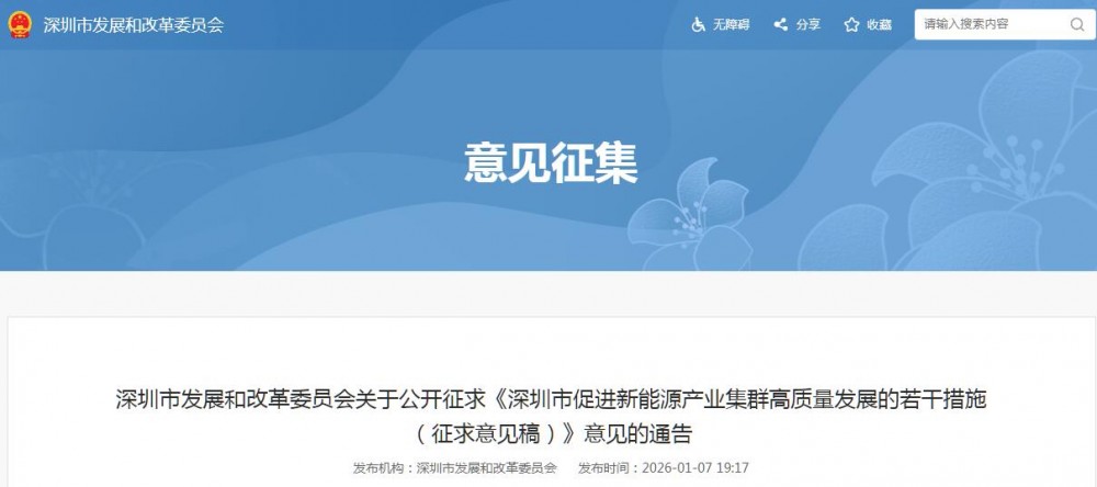 1月7日,深圳市发展和改革委员会关于公开征求《深圳市促进新能源产业集群高质量发展的若干措施(征求意见稿)》意见的通告。