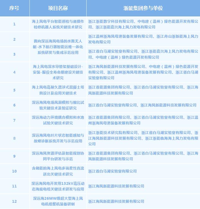 近日,省国资委、省科技厅发布了2026年度“尖兵领雁+X”科技计划深远海风电领域项目。浙能集团获批12项,其中牵头5项,参与7项,涉及海风科技公司、白马湖实验室、技术研究院、嘉海风电、浙能数科等集团所属9家单位。