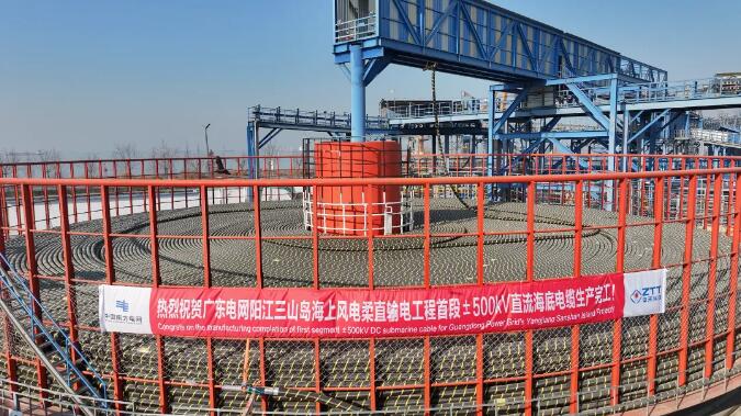 近日,全球首个超大规模海陆一体超高压柔性直流输电工程——广东电网阳江三山岛海上风电柔直输电工程首段±500kV直流海缆顺利完工仪式在中天科技海缆股份有限公司(简称“中天海缆”)举行,标志着我国深远海大容量柔直输电迈出关键一步。