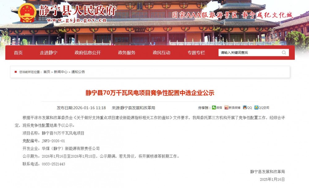 1月16日,甘肃静宁县70万千瓦风电项目竞争性配置中选企业公示。