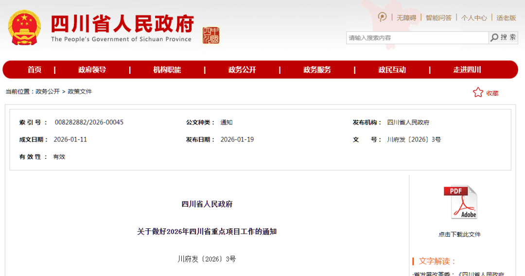 1月19日,四川省人民政府发布关于做好2026年四川省重点项目工作的通知。