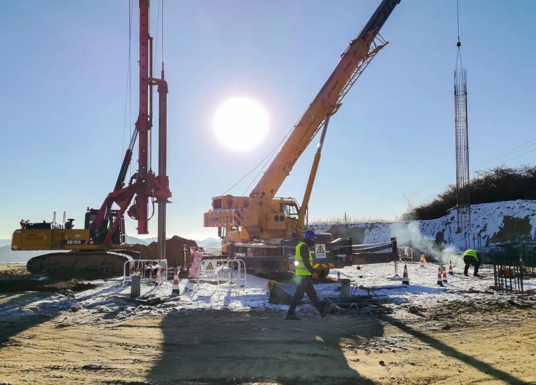项目管理团队构建了严谨的安全质量管理体系,每日开展风险分级管控与隐患排查,对施工机械、保温设施、供电线路进行全面巡检,确保万无一失。在刺骨寒风中,项目管理人员每日来往于群山之间的机位,靠前指挥,技术骨干驻场全程把控,作业人员规范值守,科学调度旋挖钻机、吊车、混凝土运输车等设备,交织成冬日里最激昂的奋进画卷。