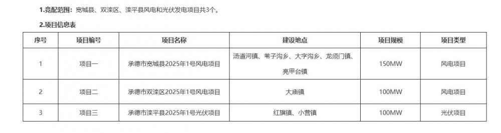 竞配范围涉及宽城县、双滦区、滦平县风电和光伏发电项目共3个,其中含风电项目250MW。