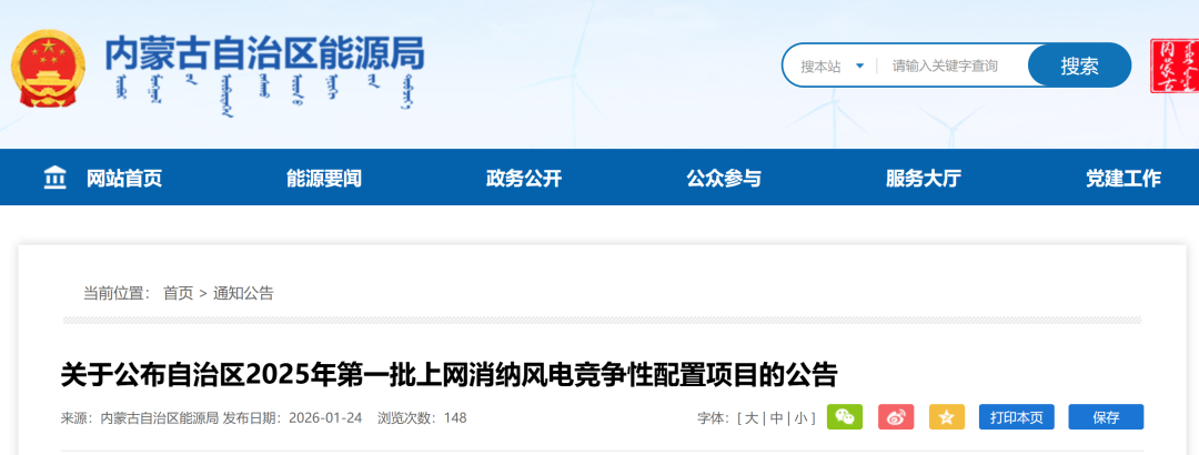 1月24日,内蒙古自治区能源局发布《关于公布自治区2025年第一批上网消纳风电竞争性配置项目的公告》。